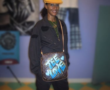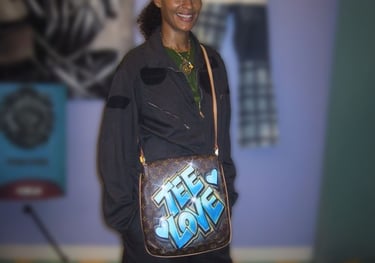 Hand-painted “The Love” custom leather shoulder bag, designed as a standout wearable art piece. for Tracy Ellis Ross